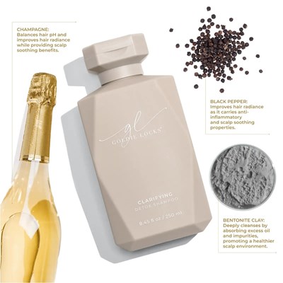 GOLDIE LOCKS Clarifying Shampoo detoxifies and deeply cleanses the scalp, removing excess oil and build-up, while restoring natural shine and promoting lasting hydration for healthy, vibrant hair.