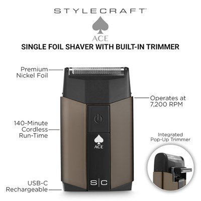 Step up to the table and raise the grooming stakes with the StyleCraft Ace Single Foil Shaver with Integrated Trimmer. This shaver is the top bet when it comes to precision, outplaying every other device in the game of quality and performance. With the supercharged motor running at an impressive 7,200 RPM, the Ace delivers unmatched power. Enhanced torque minimizes drag and irritation, delivering a shave that is always closer and always better. The premium nickel foil delivers an ultra-precise finish, even in those hard-to-reach areas. The integrated pop-up trimmer is the ultimate trump card for longer hairs or defining sharp lines. Whether detailing a beard, sharpening sideburns, or cleaning up the neck, this foil cuts with a level of precision built for high stakes. The Lithium-ion battery provides up to 140 minutes of run-time on a single charge, giving the Ace Single Foil Shaver unmatched staying power. With double the standard run-time, this powerhouse ensures uninterrupted grooming sessions, whether trimming, shaving, or detailing. Assembled with ultra-thin, Echo crunchy cutters for a close, clean shave, setting a smooth standard in grooming. USB-C rechargeability brings the convenience of fast, universal charging, making sure this trimmer is always ready for the next round. Weighing just 3.2 oz., the Ace Single Foil Shaver’s lightweight, ergonomic design makes it easy to handle, store, and take on the go. It’s the perfect companion for those who need equal parts precision and portability.